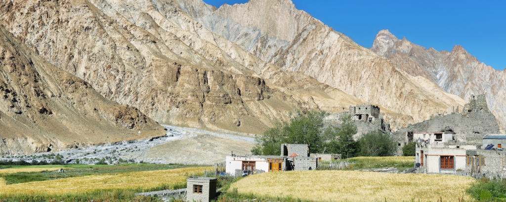 En route there is an abundance of willow thickets and poplars where ancient mani walls and chortens line the trail and barren cliffs rise high above the valley.